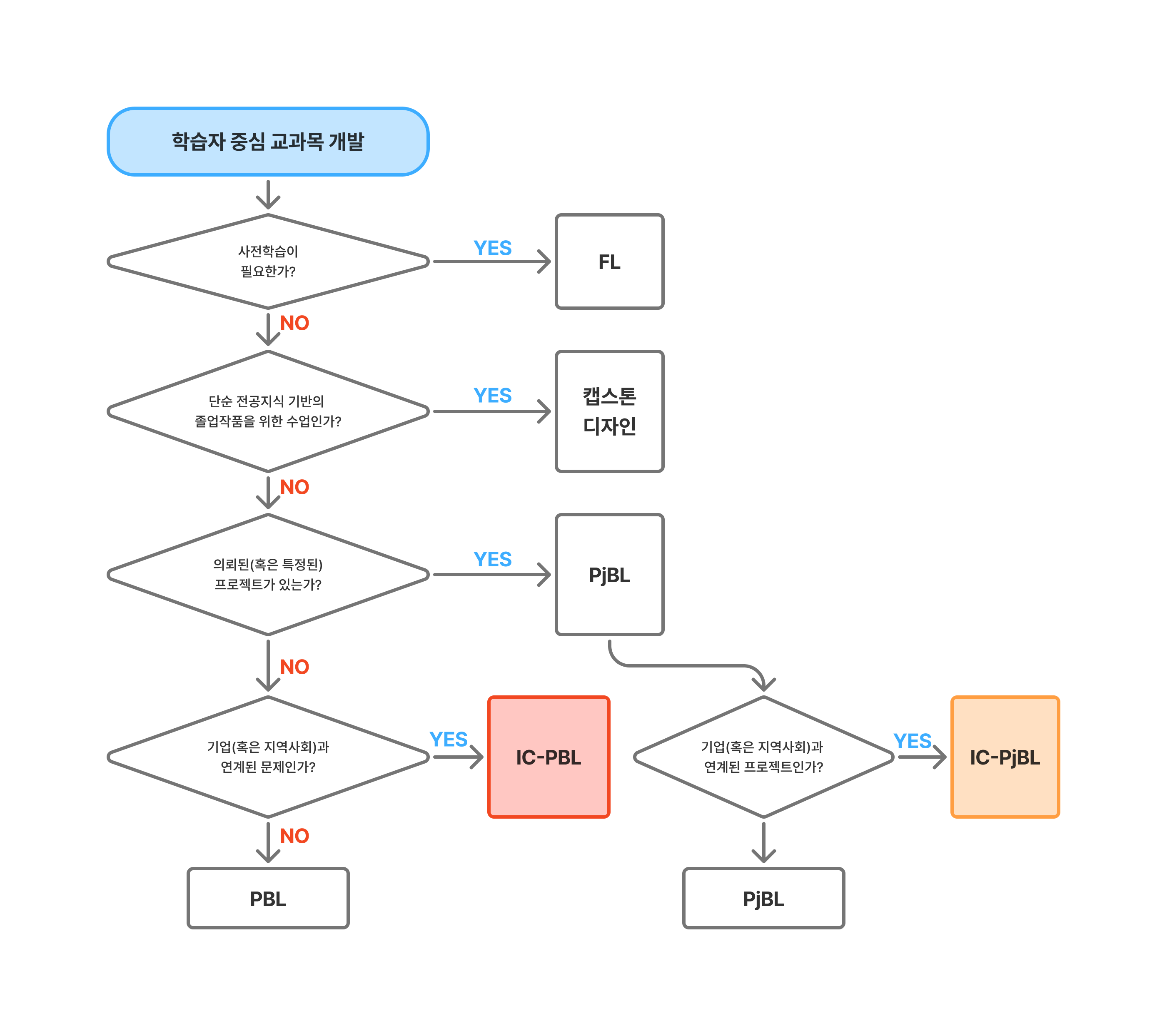 - YES → IC-PjBL: 기업이나 지자체로부터 실제 프로젝트를 의뢰받아 수행합니다. 실무 역량을 기르기에 최적화되어 있습니다.